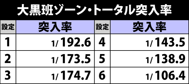0回or5回正解で大黒班ゾーン(流星チャンス)確定、1回〜4回正解時は設定4以上の当選率が高くなっている。
