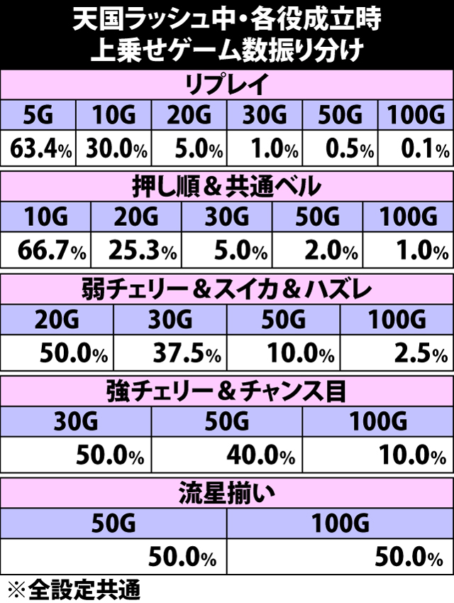 なお、天国ラッシュは10Gの保証ゲーム数があり、以降はリプレイ成立時の16.7%で転落。