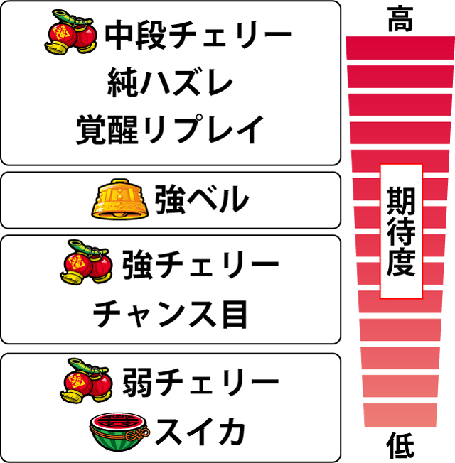 期待度が高いのは強ベル・強チェリー・強チャンス目で、中段チェリーは天RUSH確定だ。