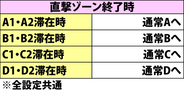 基本的に1より2、またA<B<C<Dの順に直撃ゾーンのゲーム数が多くなるため、直撃ゾーンでのボーナス当選が続くほどボーナス連チャンの期待度がアップすることとなる。
