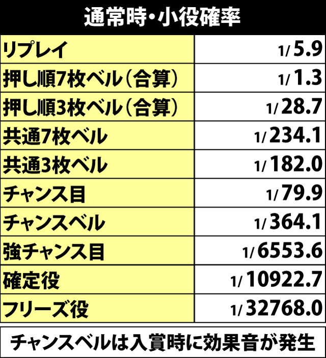 成立役は「?」や「!?」で転落の可能性がある押し順ベルが最も弱く、リプレイはややチャンス、共通ベルやチャンス役は大量上乗せに期待できる。