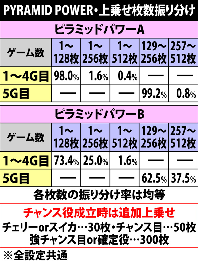 なおPYRAMID POWERは1セット終了時に約33%でセット継続となるが、継続後も上表と同様の数値で上乗せ抽選が行われる。