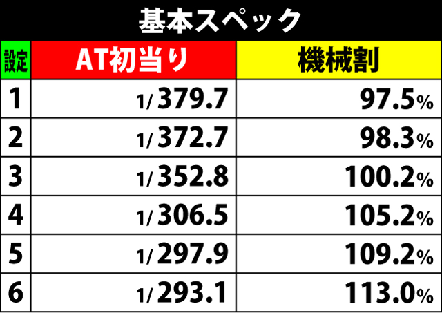 機種概要[タイプ]AT+疑似ボーナス(スマスロ)[AT性能]1セット30G+α継続(初回のみ40G+α)・純増約2.5枚/Gゲーム数上乗せ&セット継続タイプ・上位AT(純増約5.5枚/G)あり[ボーナス性能]10G〜30G継続・純増約4.6枚/G(上位AT中は純増約5.5枚/G)[50枚あたりの平均消化ゲーム数]約33G