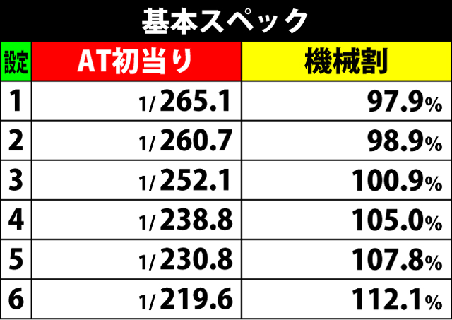 機種概要[タイプ]AT(スマスロ)[AT性能]初期枚数150枚・純増:約2.7枚/G枚数上乗せタイプ・上位AT(純増約5.0枚/G)あり[50枚あたりの平均消化ゲーム数]約31.1G