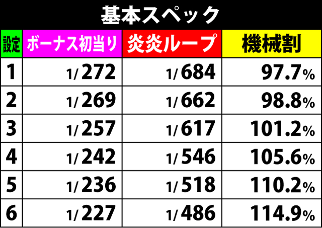 機種概要[タイプ]ST+疑似ボーナス(スマスロ)[ボーナス性能]約85枚 or 約200枚獲得(その他の上位ボーナスもあり)・純増約5.8枚/G[ST性能]1セット15G+α継続(純増約5.8枚/Gの高ループST・上位ATもあり)[50枚あたりの平均消化ゲーム数]約33.1G(設定1)